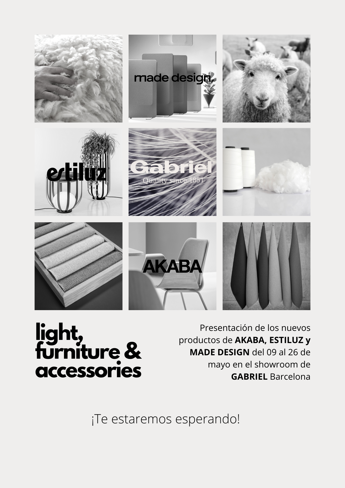 Akaba, Made design y Estiluz presentan sus nuevos lanzamientos en un entorno en el que el mobiliario, los complementos y la iluminación son los protagonistas, con el hilo conductor de los tejidos Gabriel.