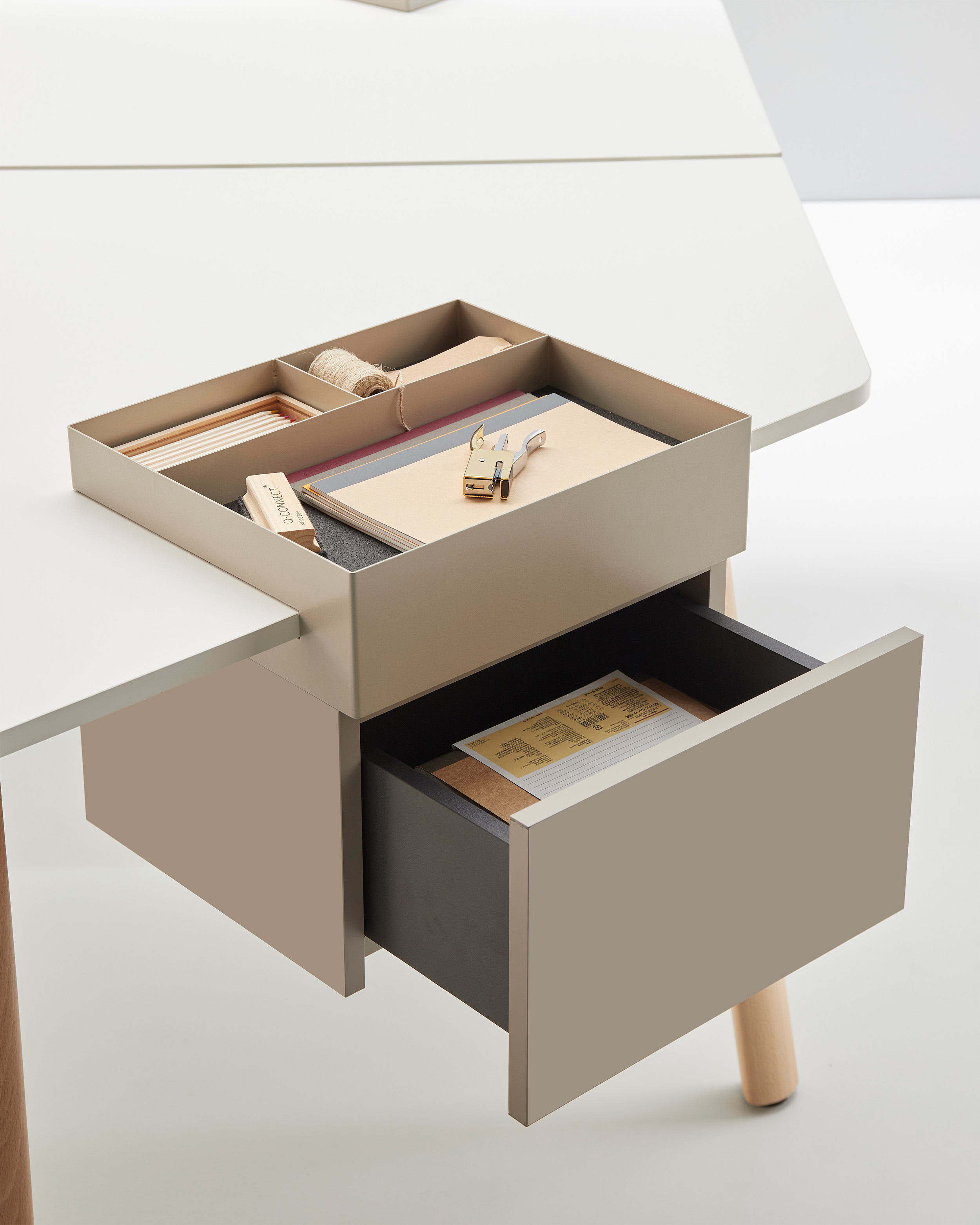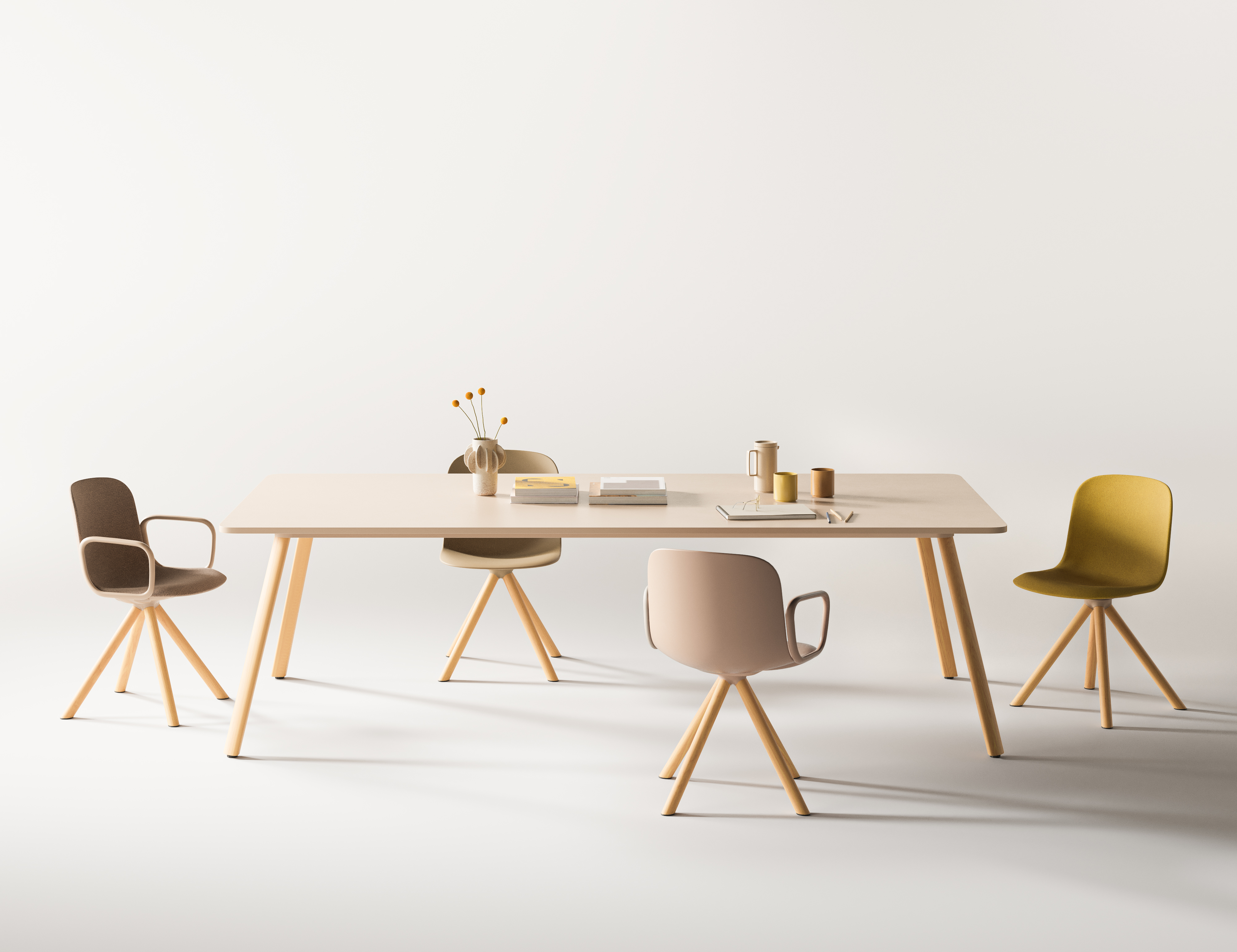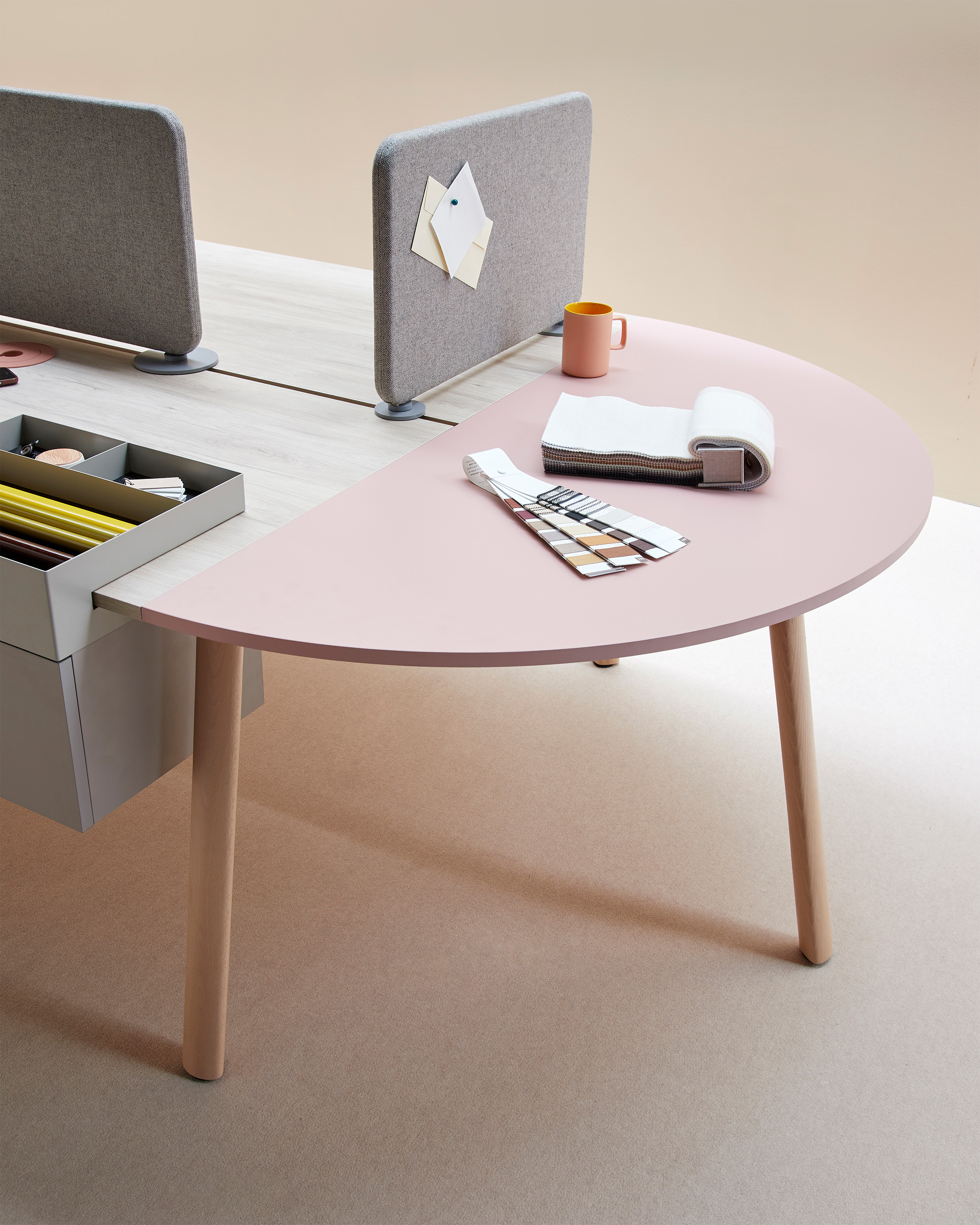 Su diseño funcional y estructural ofrece un programa versátil y escalable, con máximas posibilidades en dimensiones y mínima cantidad de patas. Se presenta en tres alturas y una amplia selección de materiales, acabados, tamaños y formas para adaptarse a la estética de cualquier espacio interior. A su vez, el programa incluye opciones de electrificación y accesorios personalizables para su aplicación en múltiples sectores como contract, oficina y hospitality.